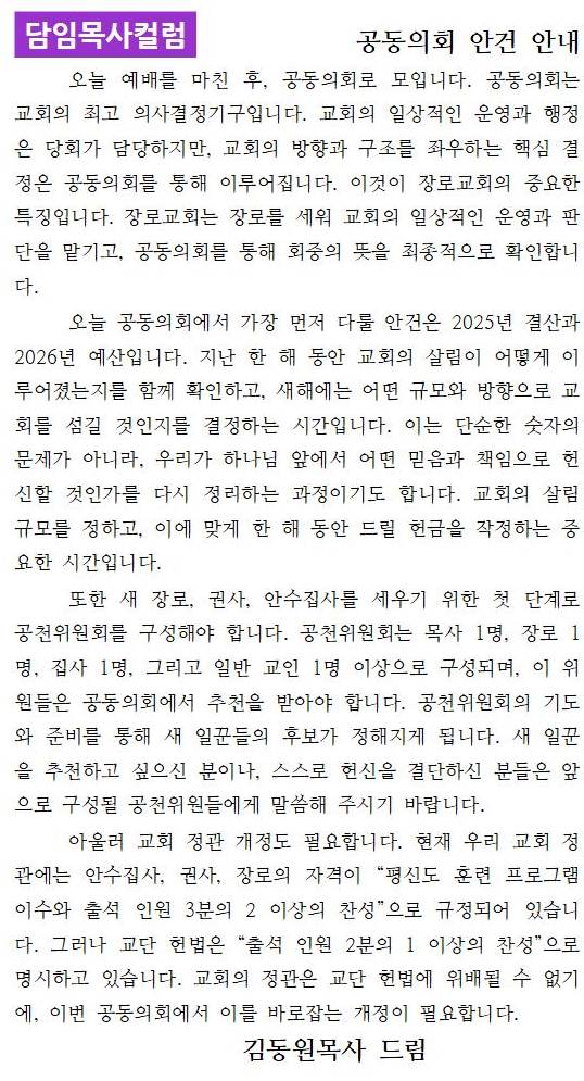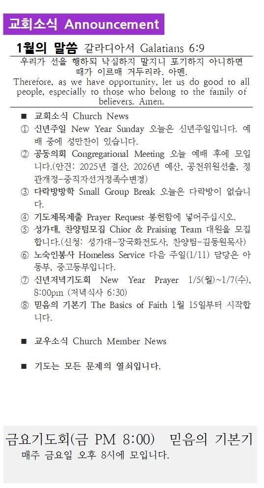 ② 공동의회 Congregational Meeting 오늘 예배 후에 모입니다.(안건: 2025년 결산, 2026년 예산, 공천위원선출, 정관개정-중직자선거정족수변경)