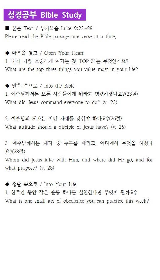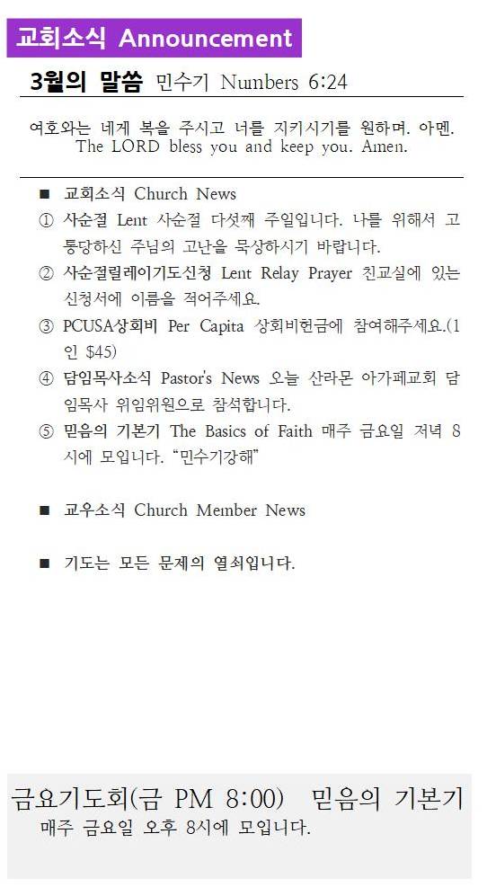 ② 사순절릴레이기도신청 Lent Relay Prayer 친교실에 있는 신청서에 이름을 적어주세요.